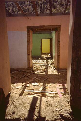 This was a stretch of the main street. Most houses have been dismantled to the widest extend possible. People removed the roofing, wooden floors, and at last the doors and windows. The house shown here is reaching that stage. Meanwhile, some people stayed in the town until the last moment, trying to dilate the inevitable.