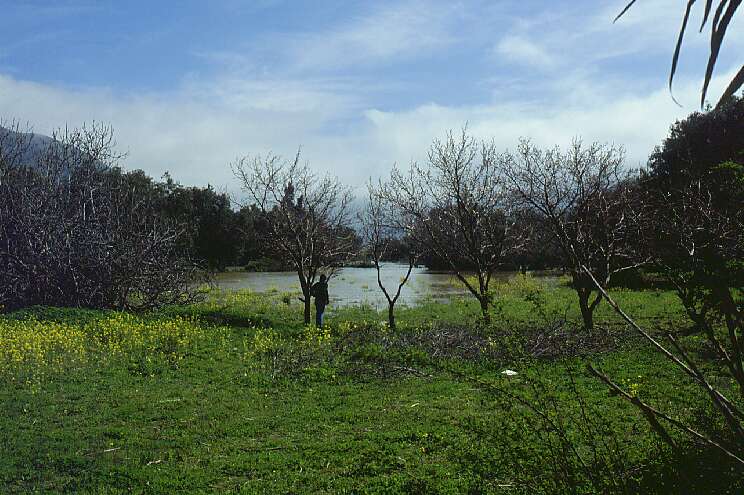 February 2002. A rainy 2001 winter had done a great job in accumulating a good quantity of water, and the high summer temperatures in february were melting the snow accumulated in the high mountains. The river was coming down full to the brim, and one could almost watch the lake's water level rise! The vineyards are history, and an almost idyllic lake has replaced them, even including an island!