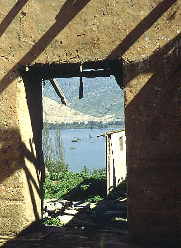 Through a doorway of an abandoned house, the lake can bee seen invading the town's periphery.
