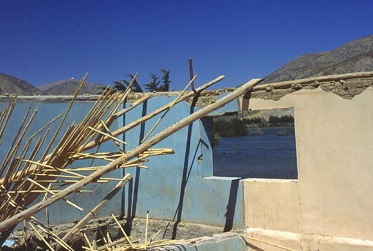 It's time to introduce Gualliguaica. It was a typical roadside town, naturally developed during centuries. Almost all construction was of adobe, which is inexpensive and provides very comfortable housing in this climate of strong day-night temperature changes. The houses had gardens full of fruit trees. But now, the town had been abandoned almost completely. The water was coming, meter after meter, to implacably take possession.