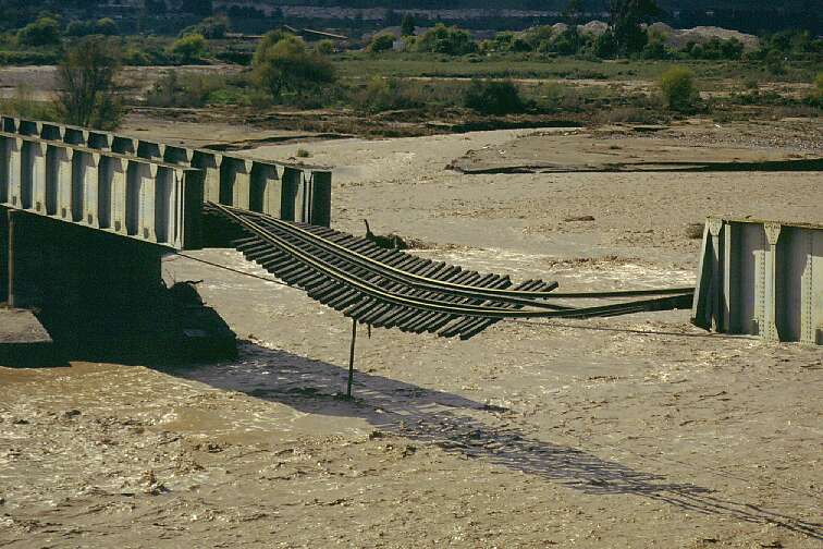 During the winter of 1997 we had such a rainstorm. The river swelled and caused extensive damage. This bridge normally is used by several large trains a day, which bring iron ore from the Romeral mine to the Guayacán port. Romeral had a pretty hard time minimizing impact on operations while an emergency repair was applied to the bridge.