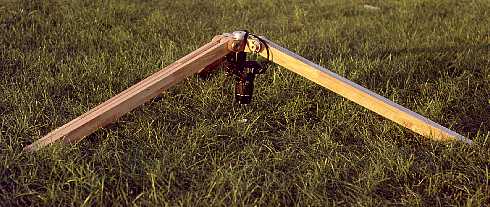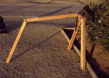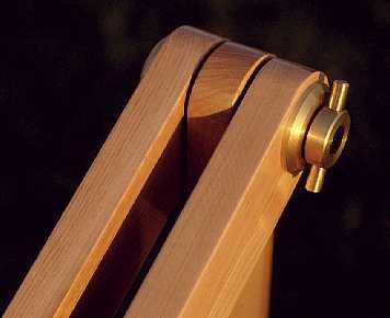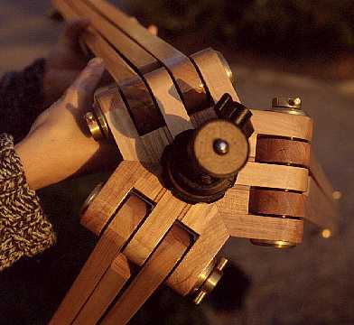 Note that the triangle/leg junctions need to flex the wood a little bit in order to lock or release the joint. I had my reservations with this approach, but it turned out to work well. It requires, however, a precise fit of the pieces. Since the wood is not very precisely sized at the lumber yard, and I cannot do it better myself, I used the wood as it came, and made each clutch disk to the exact size required by the tolerances of the wood. So, the disks vary in thickness by up to 0.2mm, and are not freely interchangeable, should I ever disassemble the tripod.