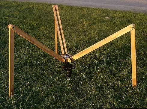 Regardless of whether the main feet or the knees are used, this tripod always stands on wood. Commercial tripods tend to have a choice between rubber feet or metal spikes. I never liked that! The rubber feet make a tripod wobble, while spikes tend to slowly bury themselves in soft ground; both things are bad for stability! In addition, the spikes can scratch a floor. Rounded wooden feet instead provide an ample contact surface without excessive elasticity. On smooth floors they tend to slip, but with the stiffness of this tripod, and the combined weight of it with the camera, this has proven to be no problem.